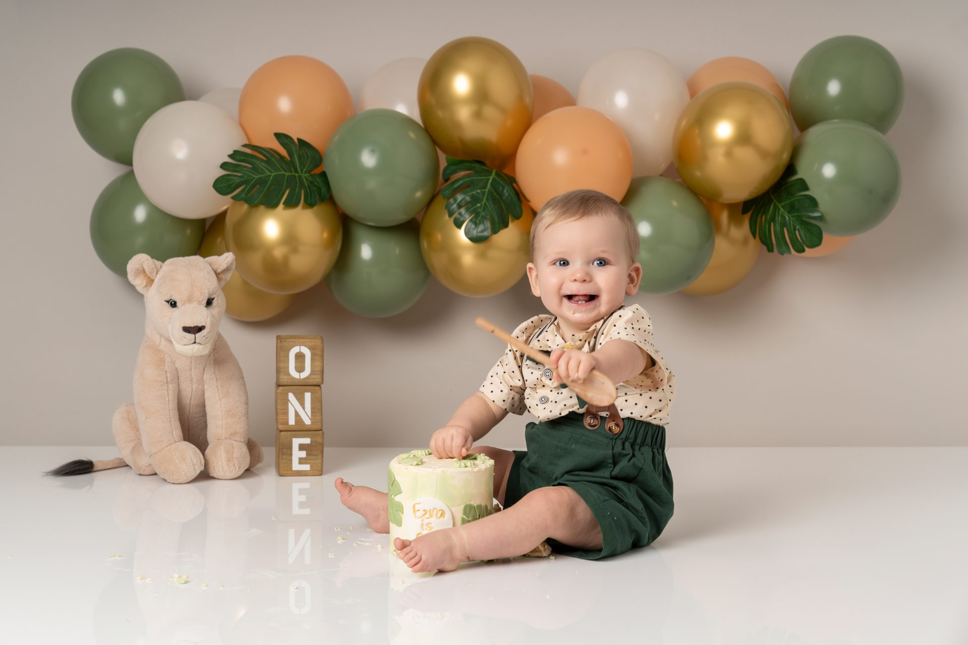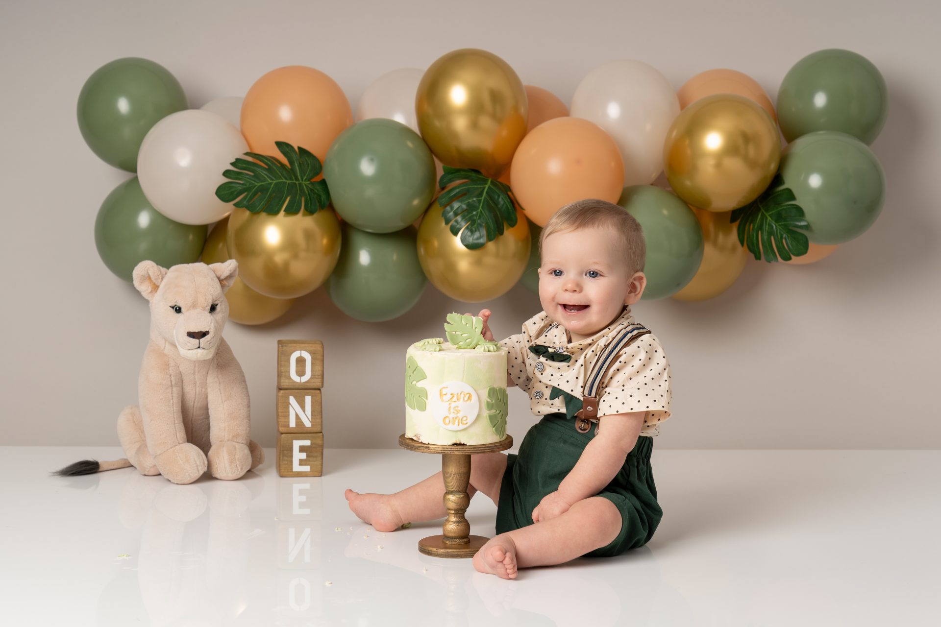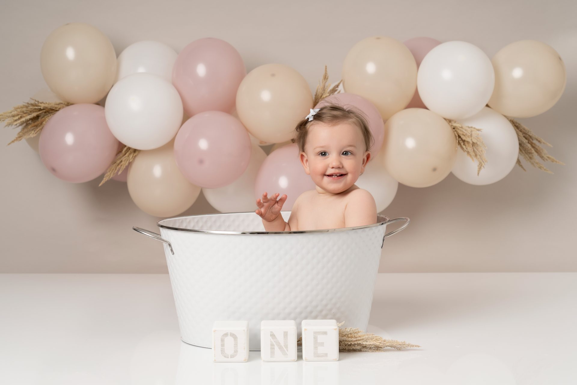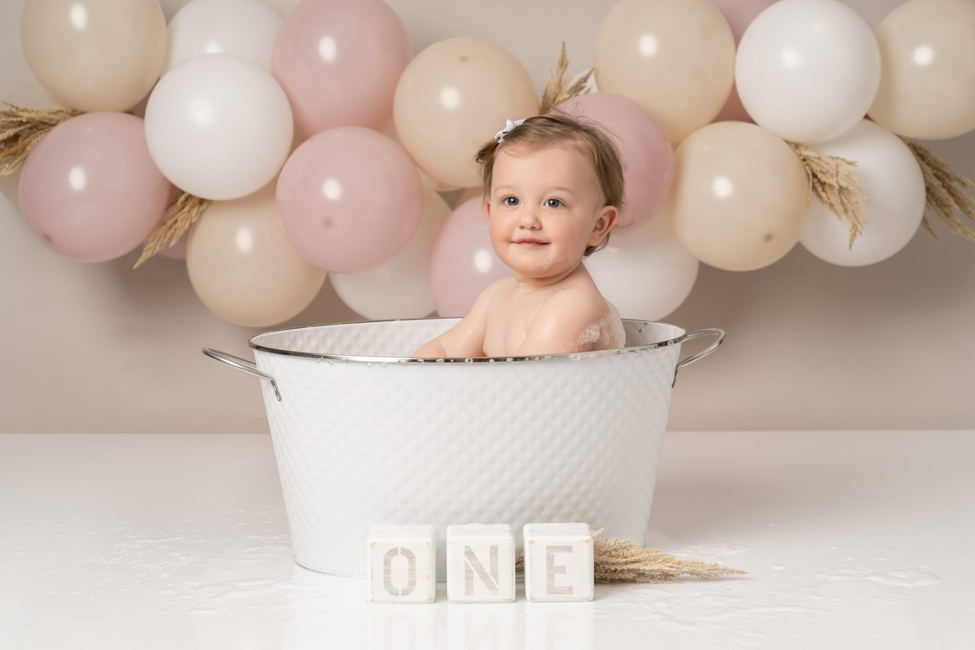 A cake smash photoshoot is a themed portrait session to celebrate your baby turning one. Your child gets to explore, play with, and smash a birthday cake while we capture every joyful and messy expression. It's a fun, relaxed way to mark a special milestone with stunning images you'll cherish forever. There are three sections to our cake smash sessions, the first is a little portrait with the ONE blocks to help little one get used to the new environment, then we introduce the cake and get messy. After this we let them splash in a mini bath/tub.