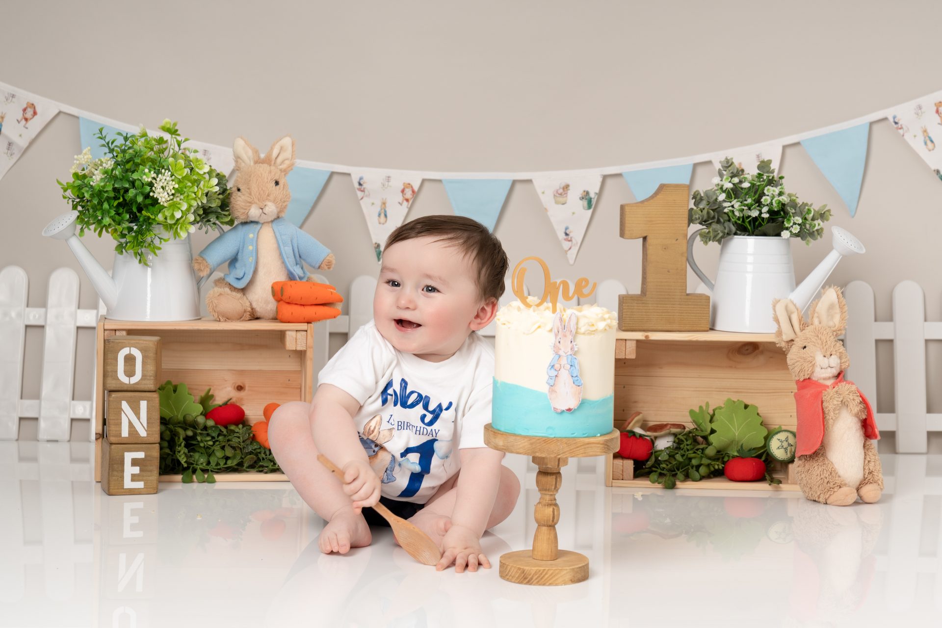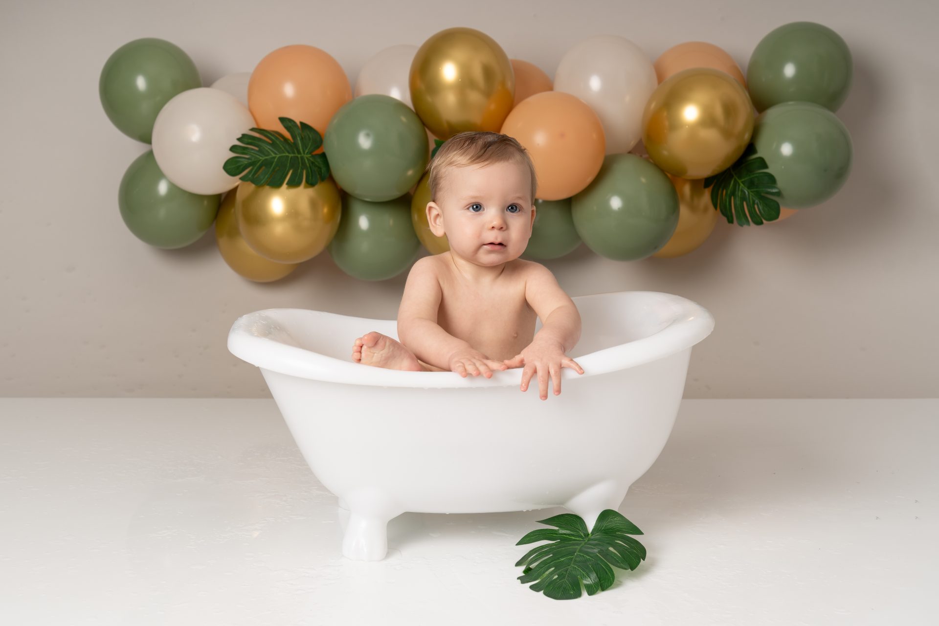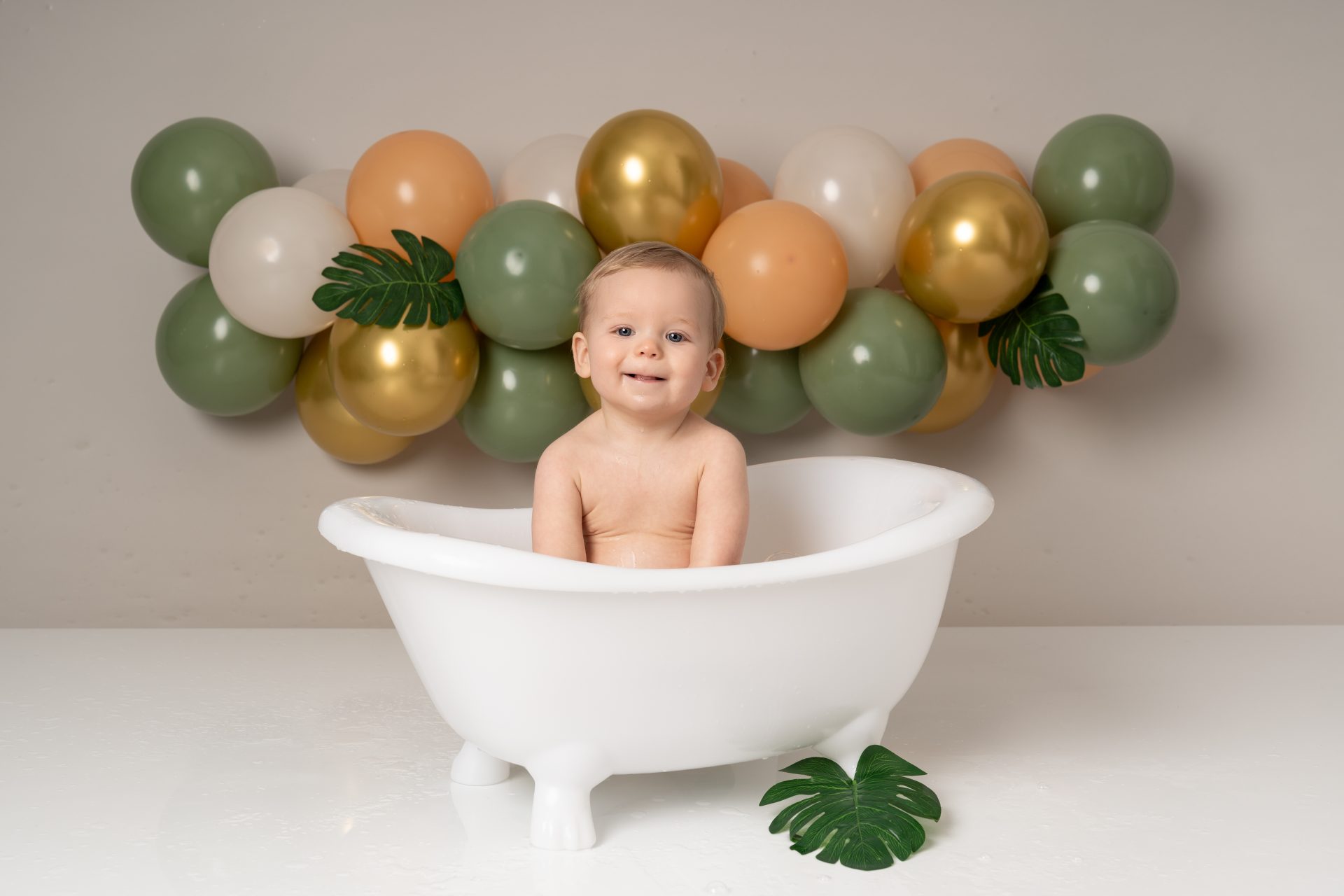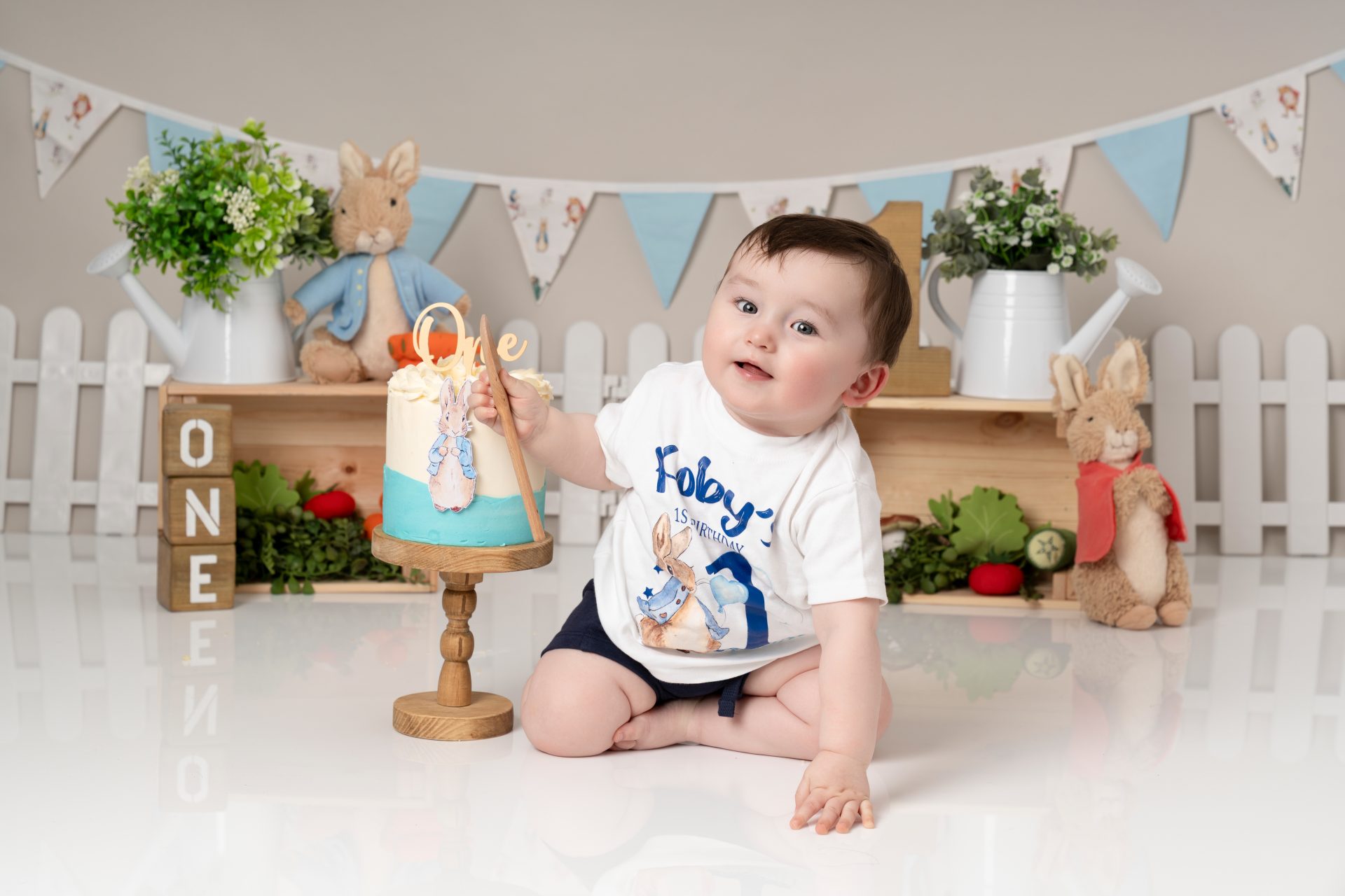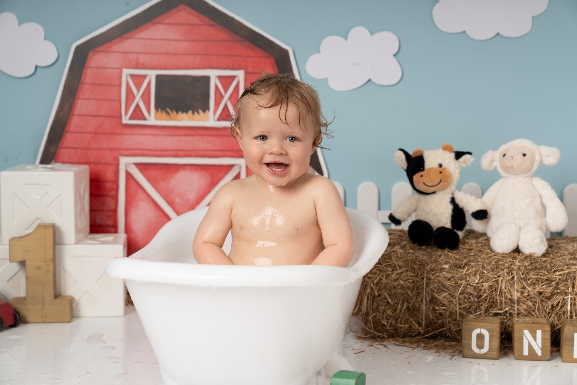 A cake smash photoshoot is a themed portrait session to celebrate your baby turning one. Your child gets to explore, play with, and smash a birthday cake while we capture every joyful and messy expression. It's a fun, relaxed way to mark a special milestone with stunning images you'll cherish forever. There are three sections to our cake smash sessions, the first is a little portrait with the ONE blocks to help little one get used to the new environment, then we introduce the cake and get messy. After this we let them splash in a mini bath/tub.