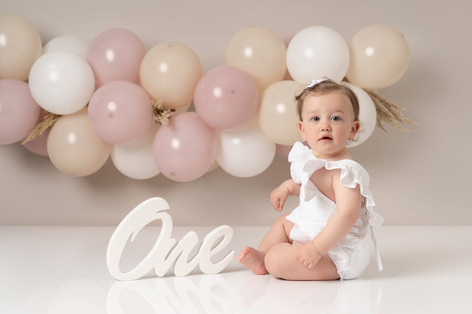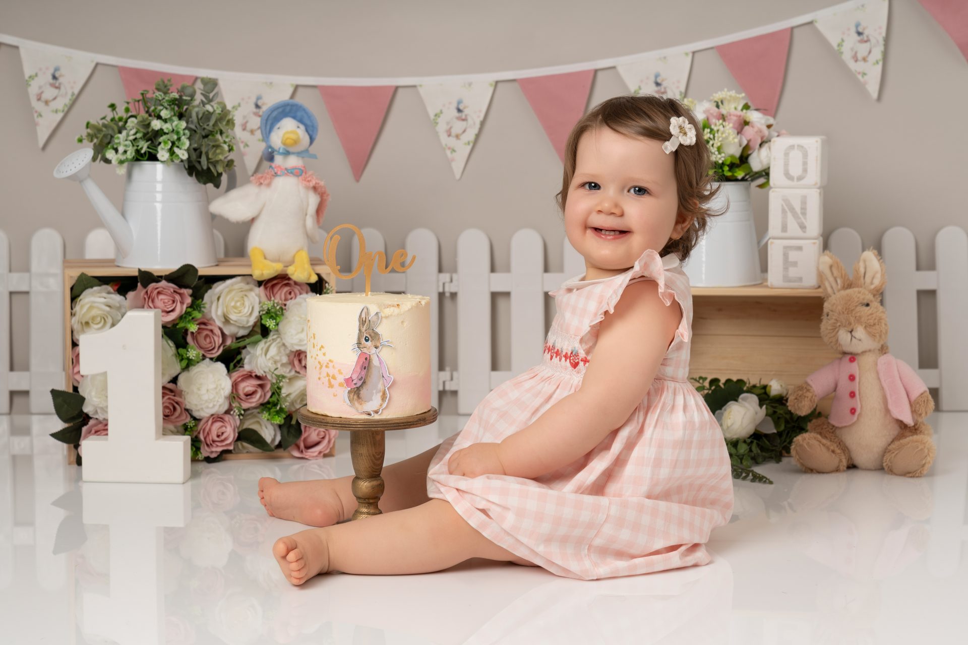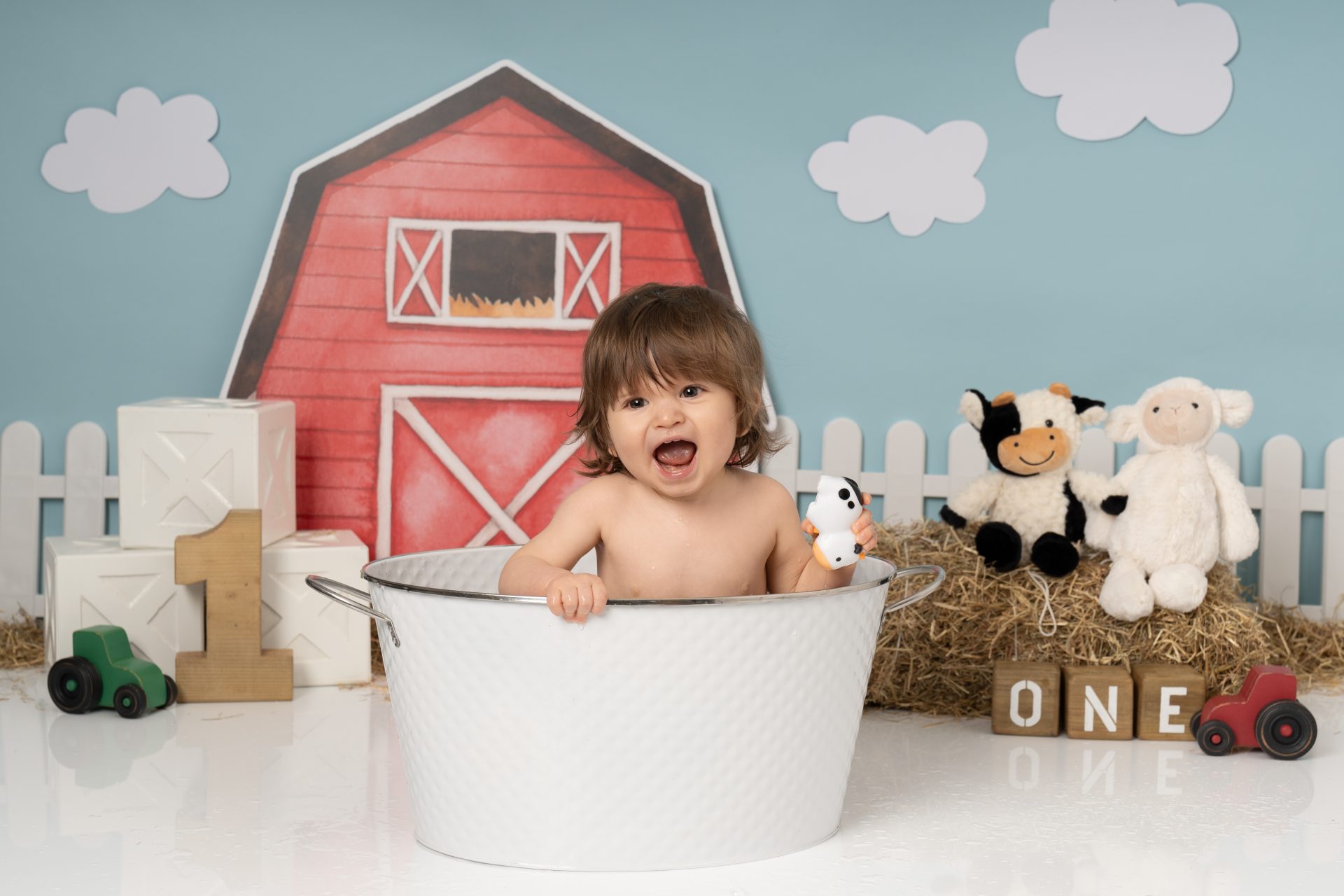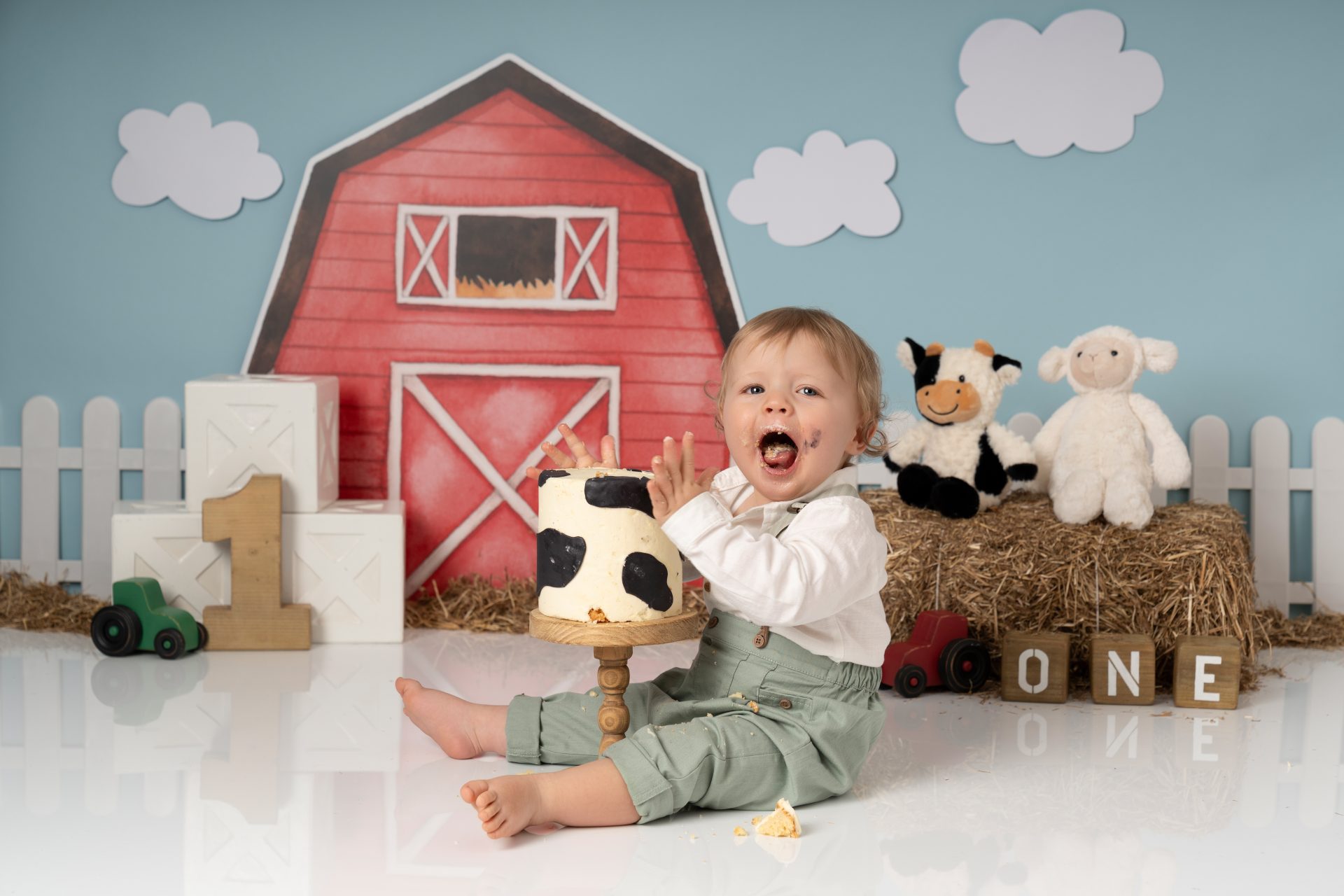 A cake smash photoshoot is a themed portrait session to celebrate your baby turning one. Your child gets to explore, play with, and smash a birthday cake while we capture every joyful and messy expression. It's a fun, relaxed way to mark a special milestone with stunning images you'll cherish forever. There are three sections to our cake smash sessions, the first is a little portrait with the ONE blocks to help little one get used to the new environment, then we introduce the cake and get messy. After this we let them splash in a mini bath/tub.