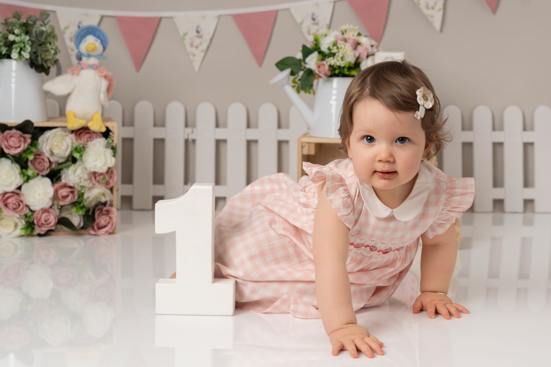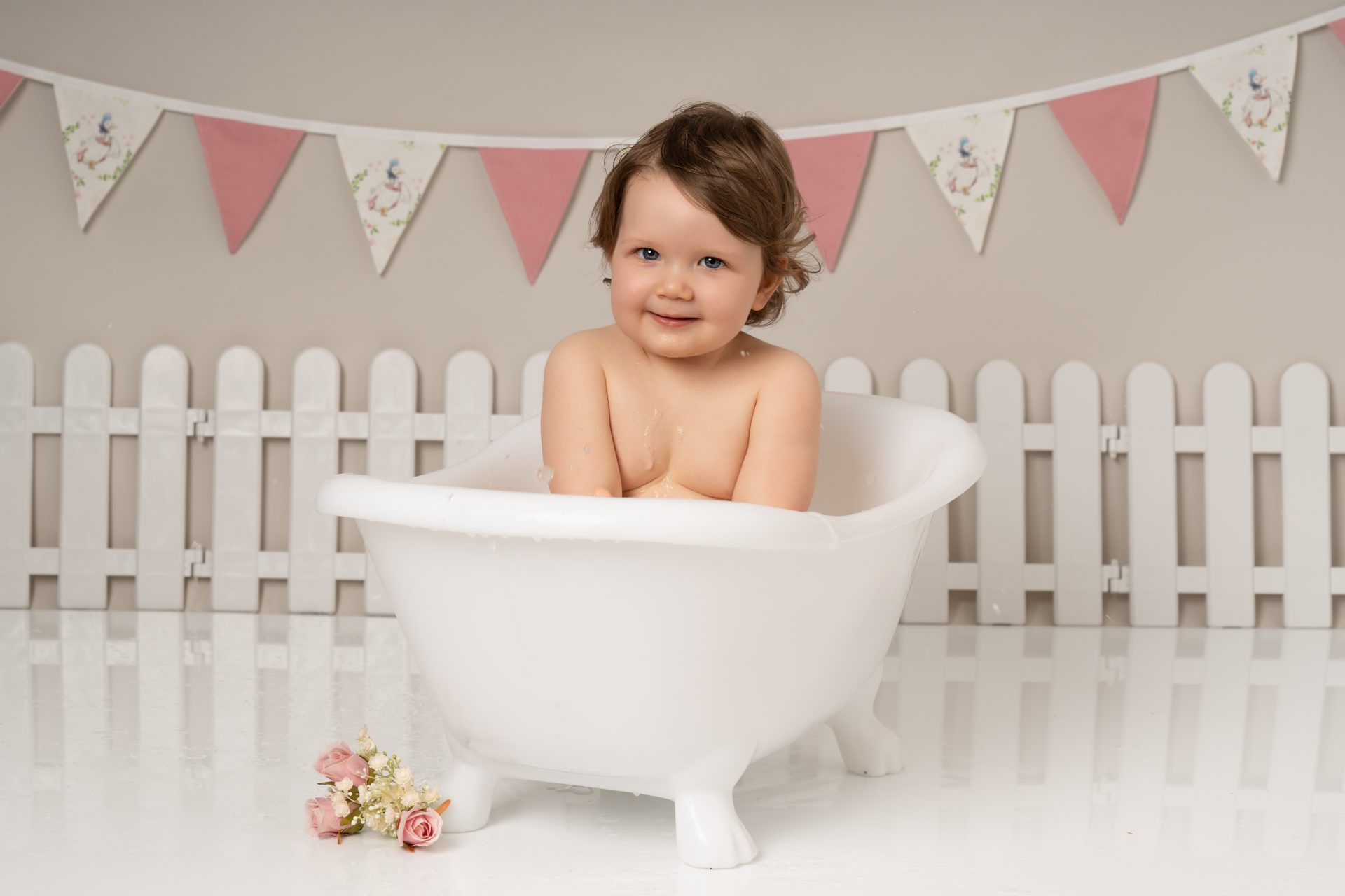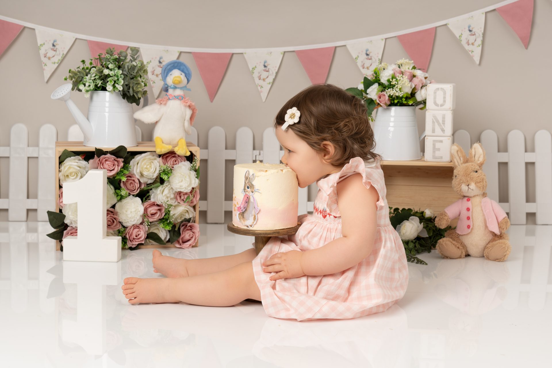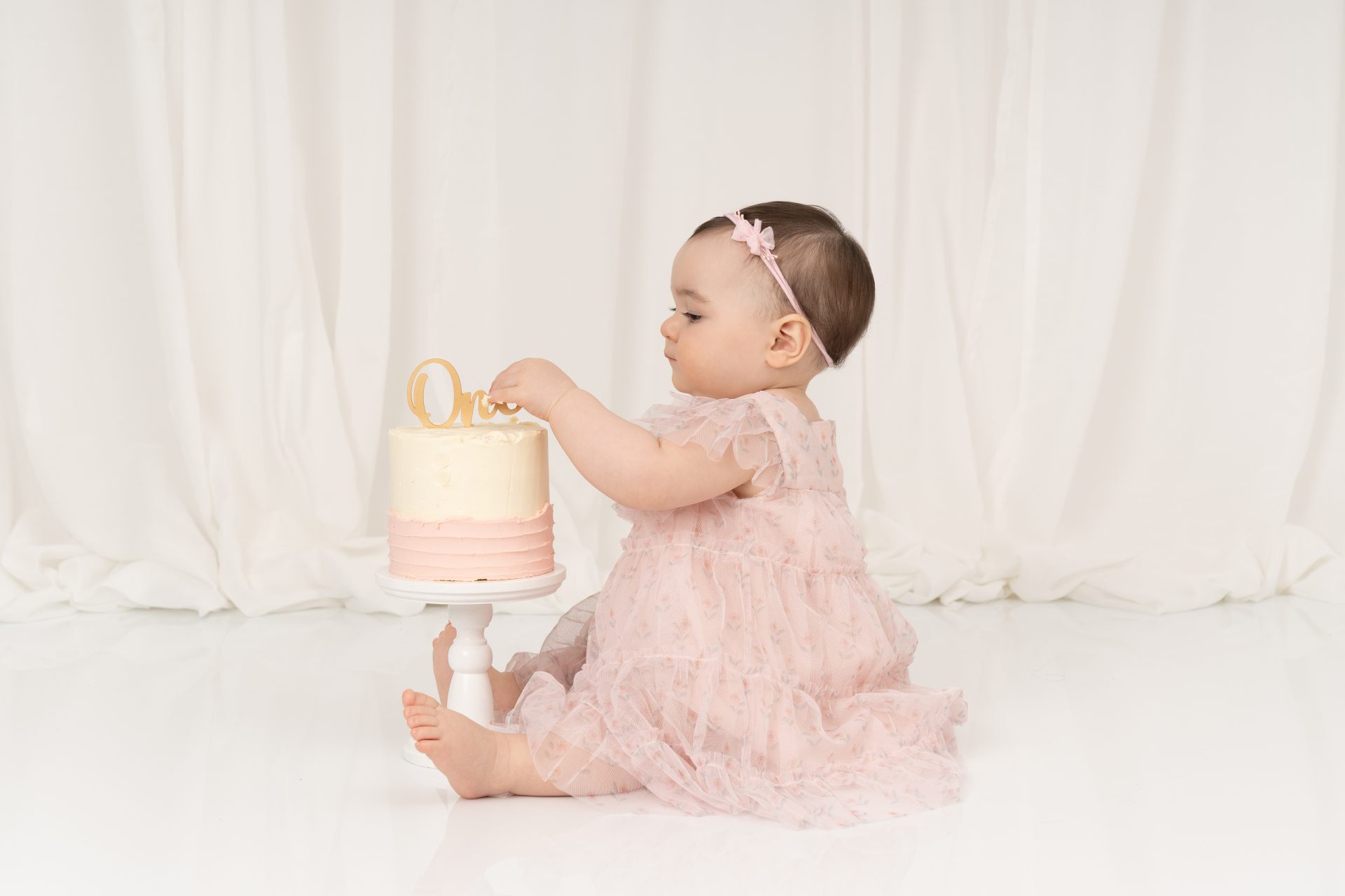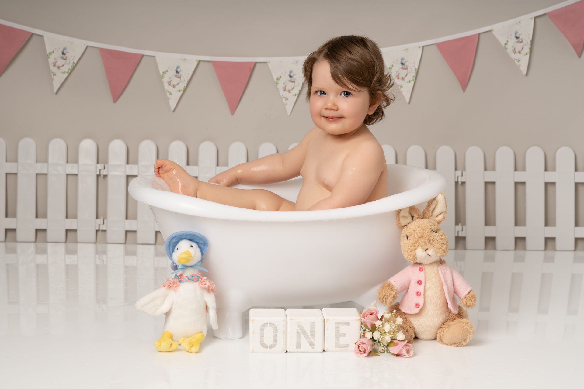 A cake smash photoshoot is a themed portrait session to celebrate your baby turning one. Your child gets to explore, play with, and smash a birthday cake while we capture every joyful and messy expression. It's a fun, relaxed way to mark a special milestone with stunning images you'll cherish forever. There are three sections to our cake smash sessions, the first is a little portrait with the ONE blocks to help little one get used to the new environment, then we introduce the cake and get messy. After this we let them splash in a mini bath/tub.