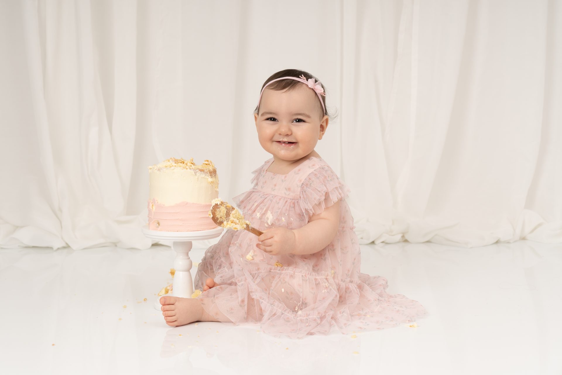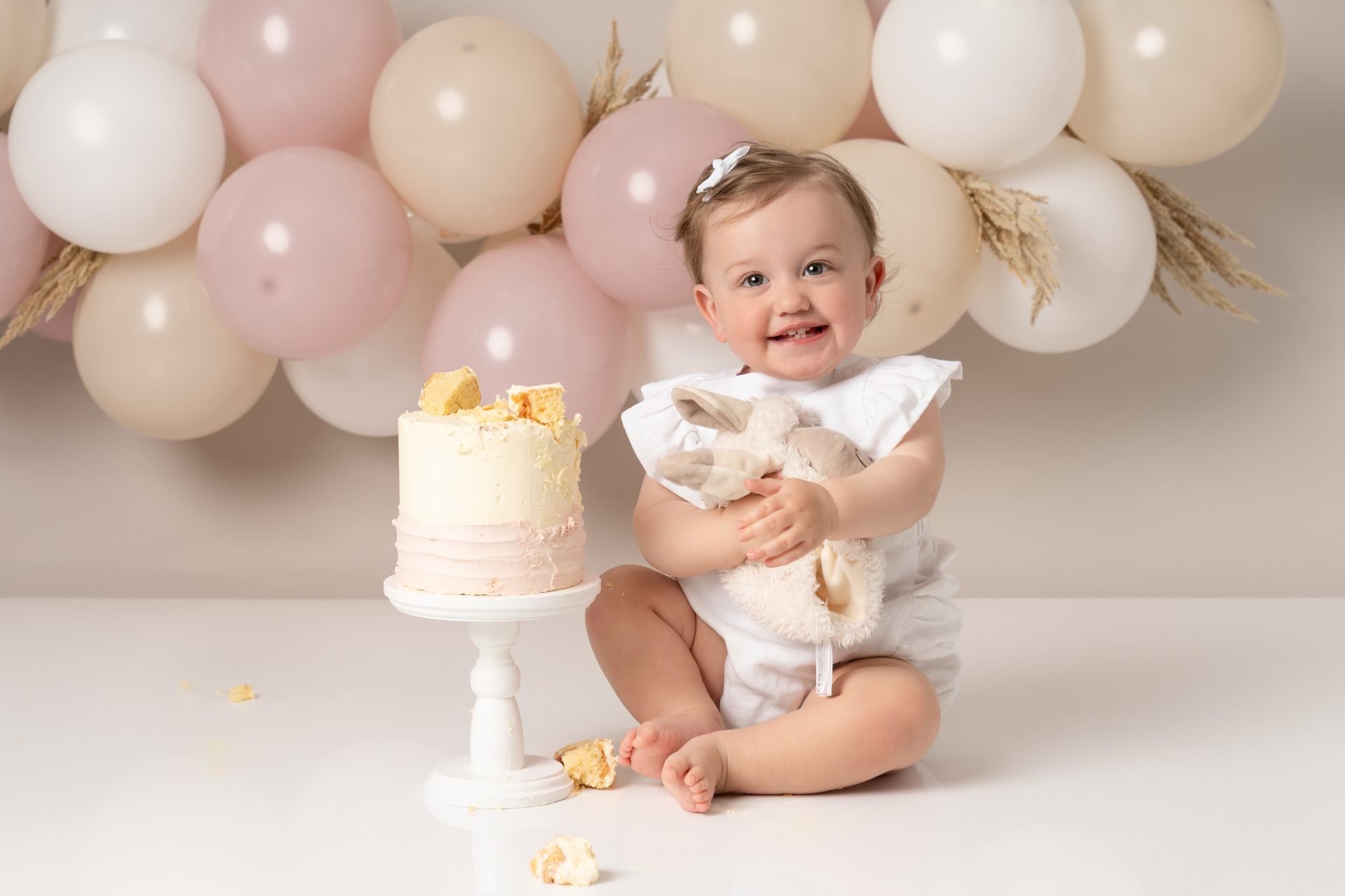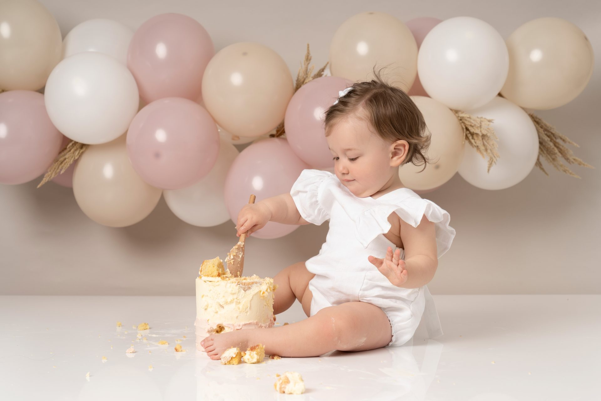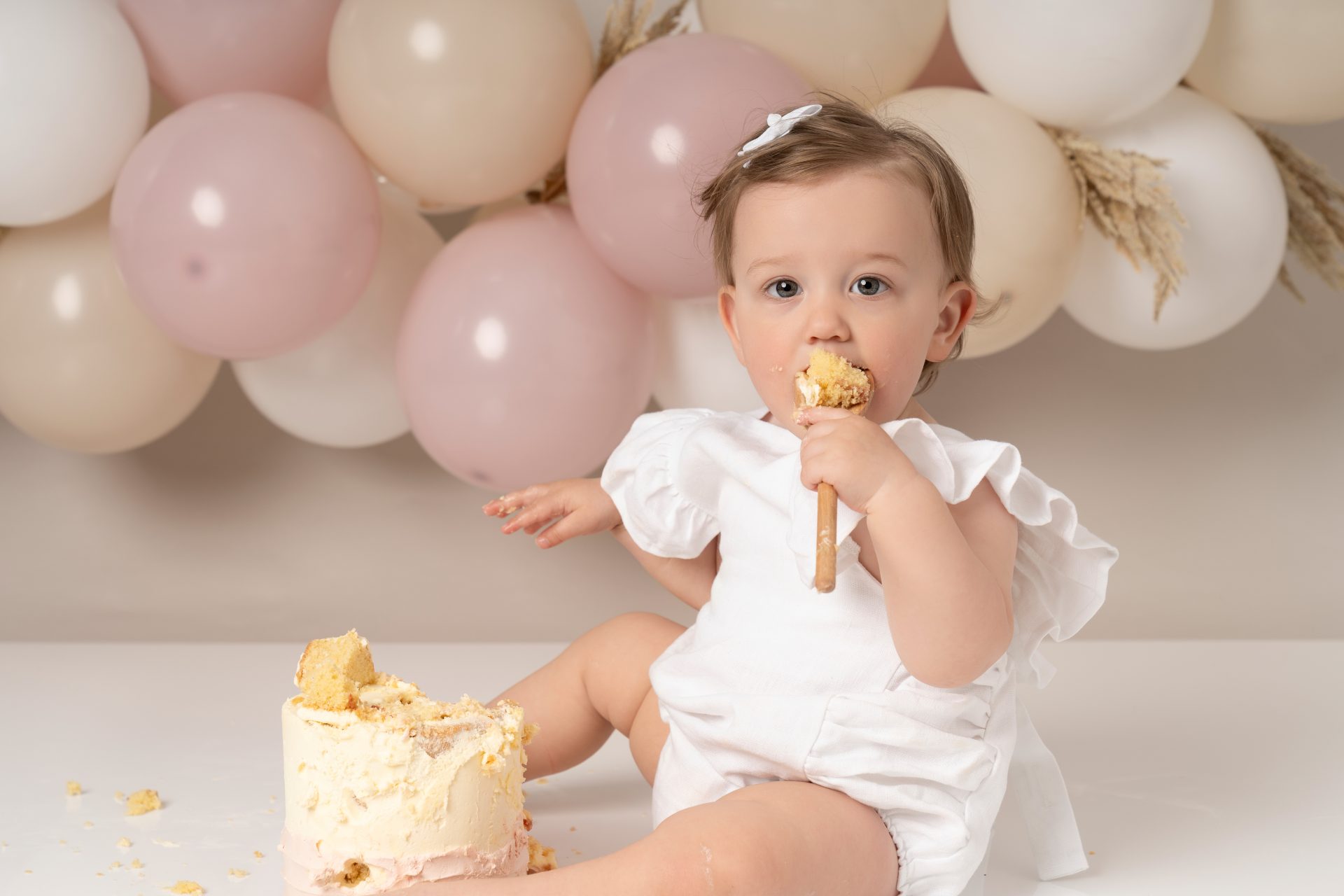 Every baby is different! Some dive right in, others are more cautious. If your baby isn’t a fan of the cake, we still capture lots of beautiful photos with natural reactions. Bringing a favourite snack or toy can help ease them in. Lots of parents bring veg stick crisps which are great to put in the back of the cake so little ones start playing with the cake.