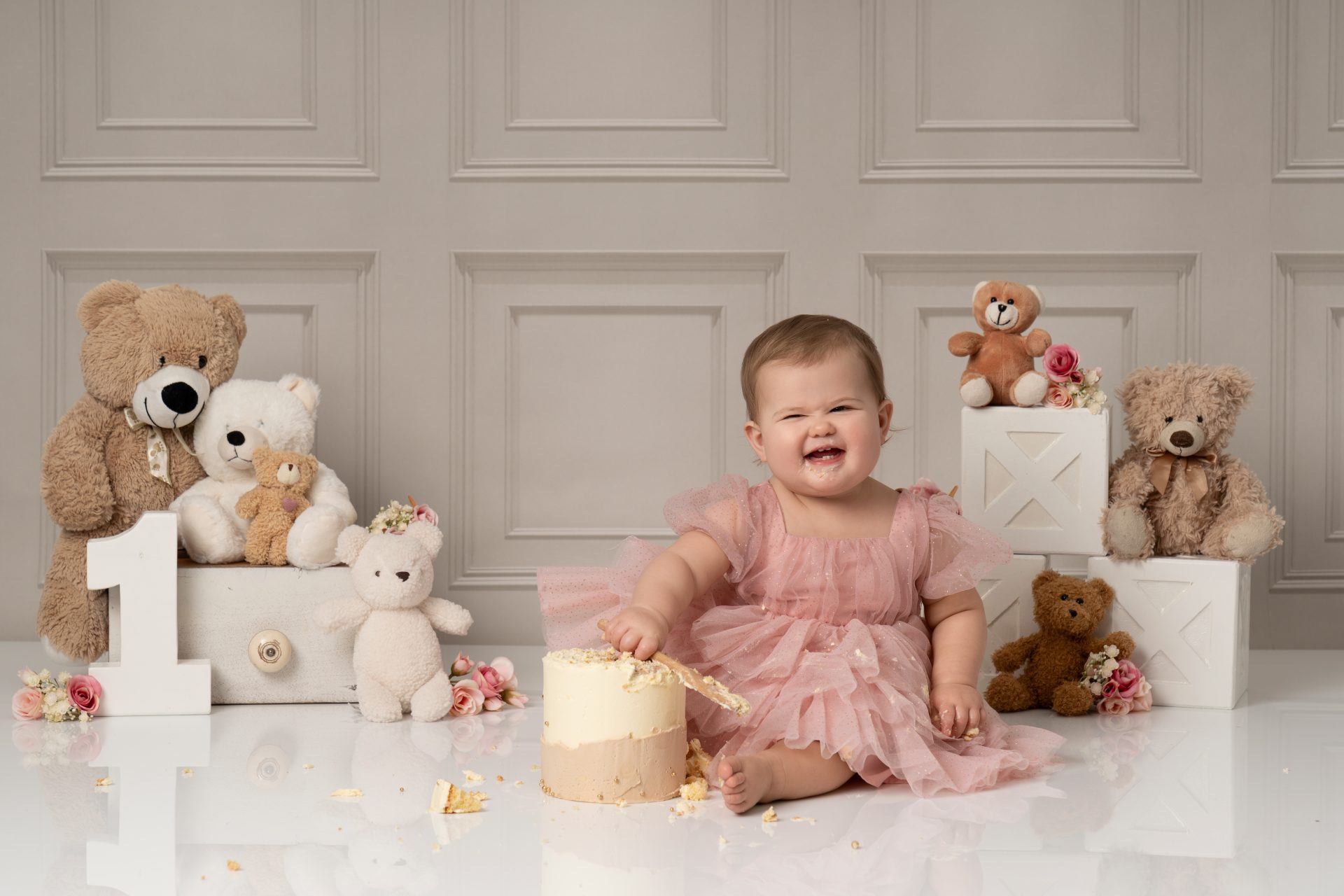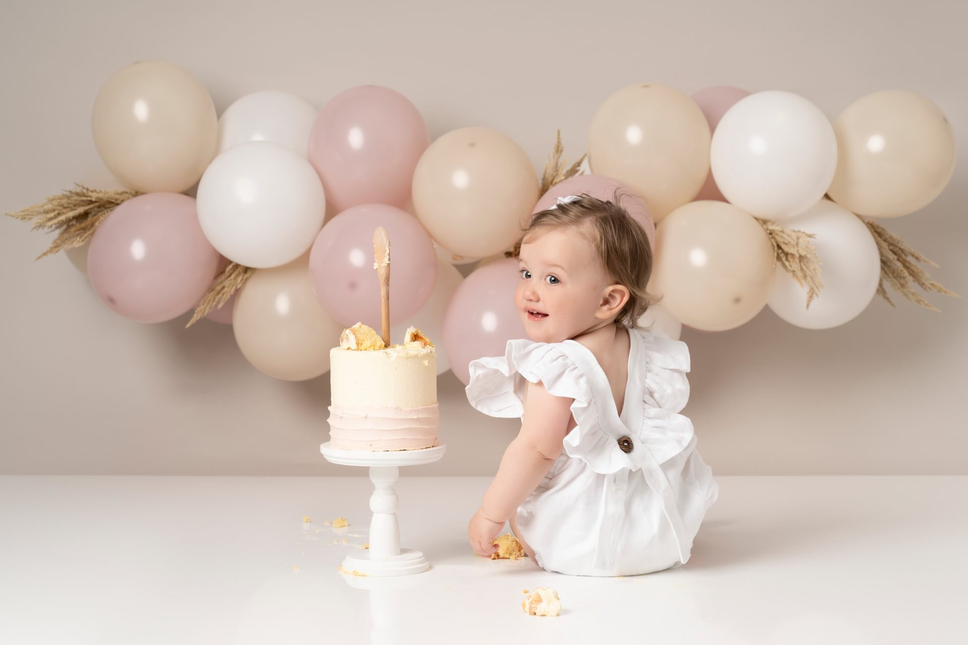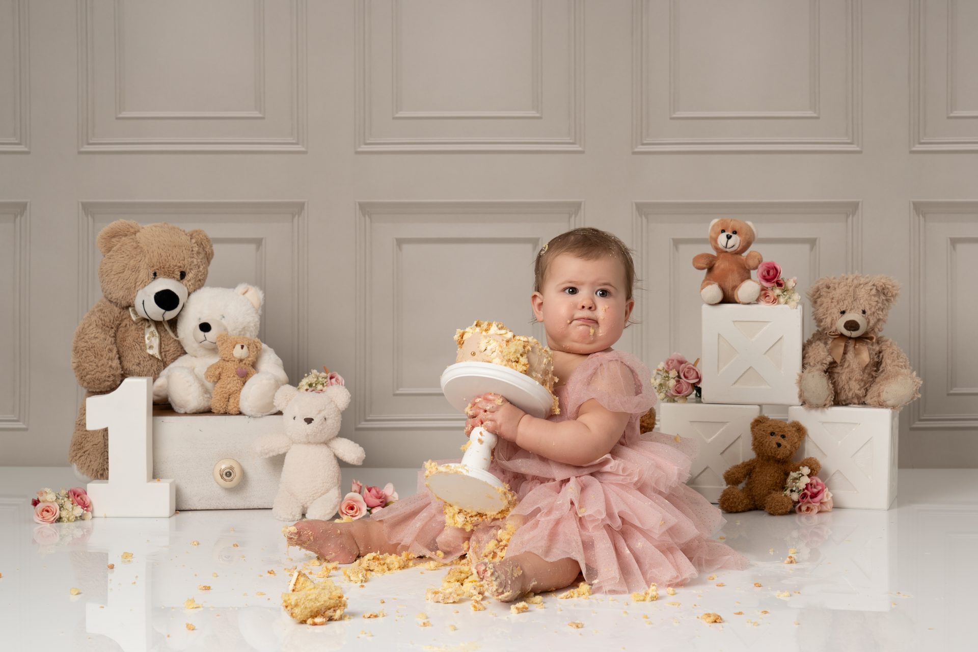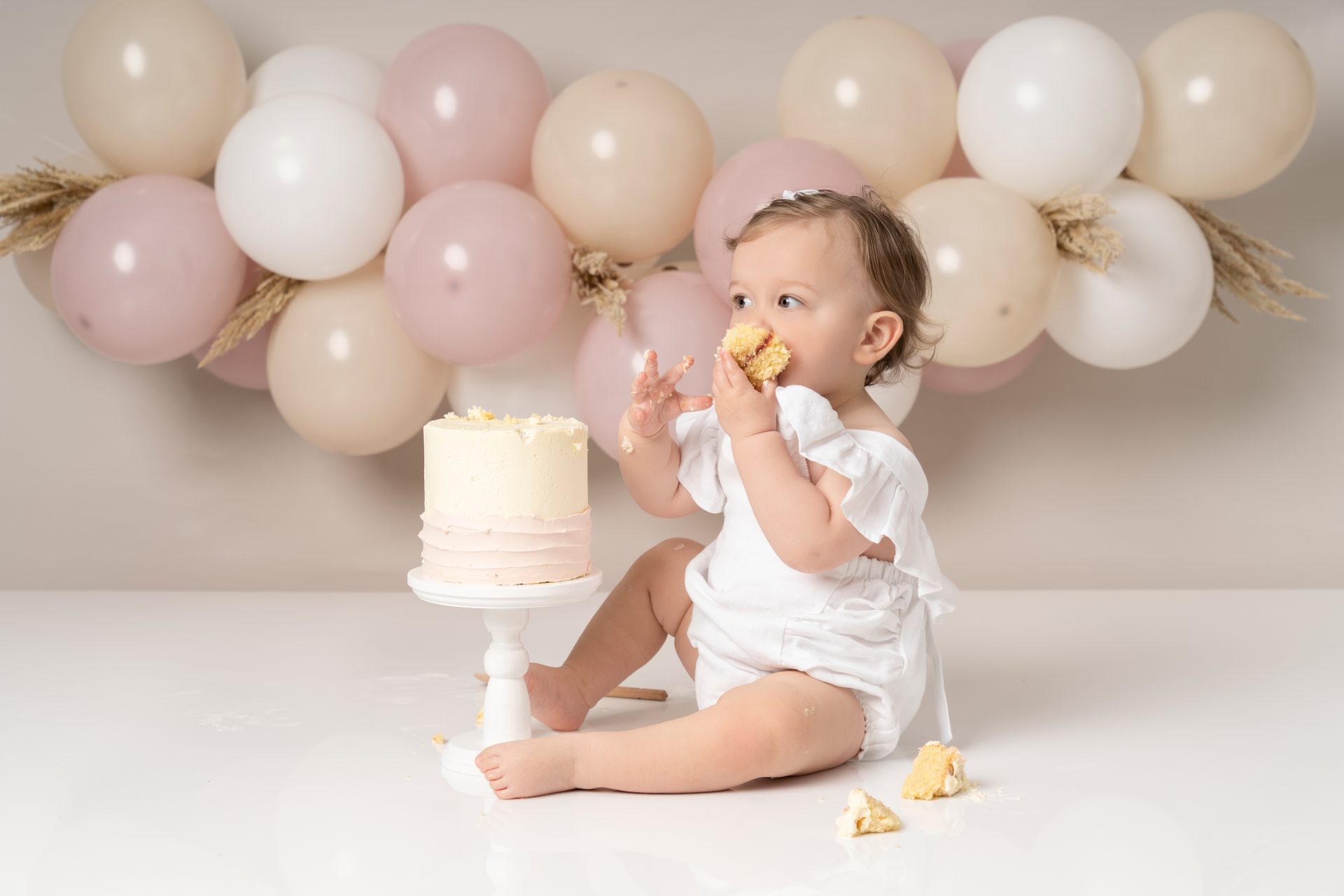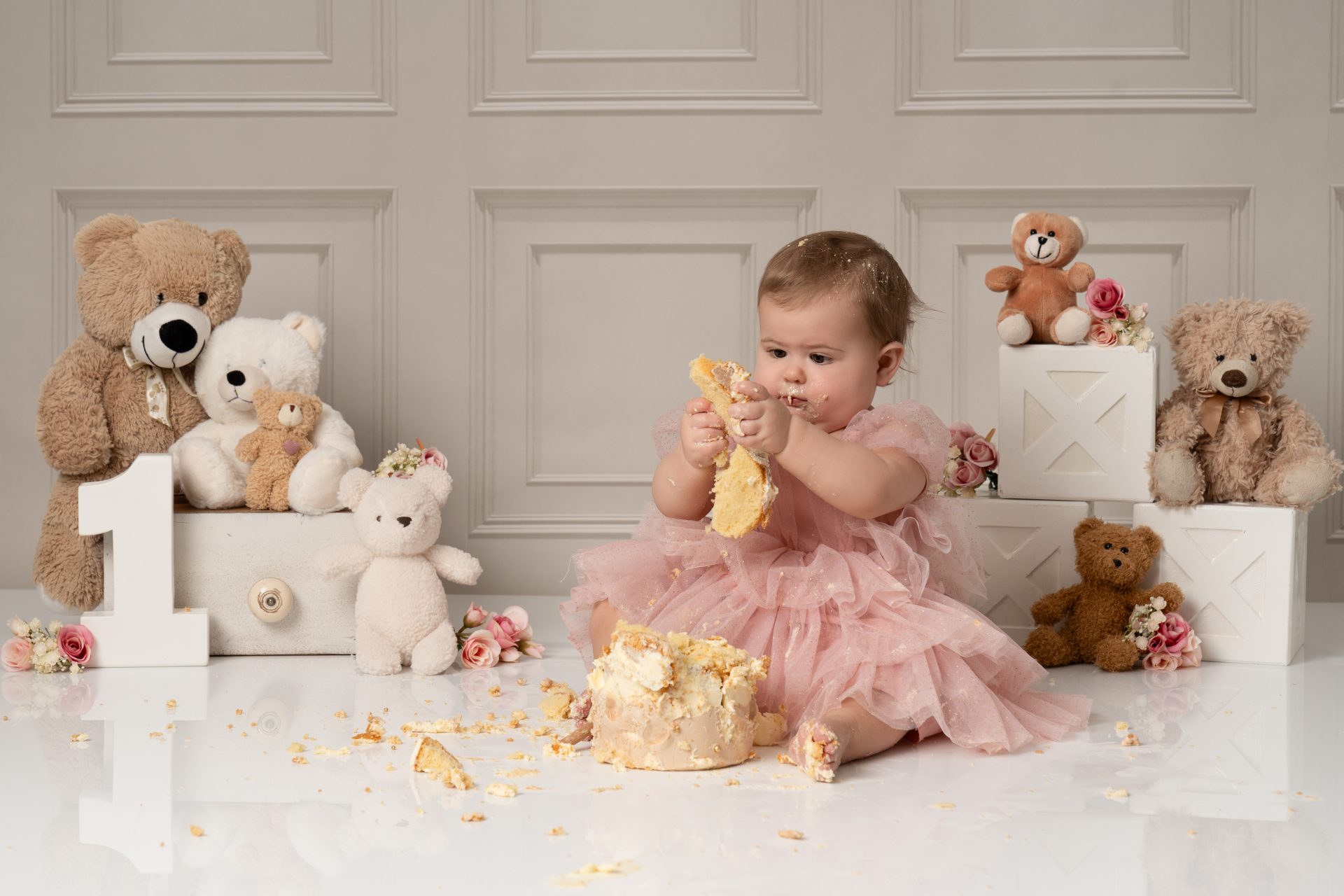 Every baby is different! Some dive right in, others are more cautious. If your baby isn’t a fan of the cake, we still capture lots of beautiful photos with natural reactions. Bringing a favourite snack or toy can help ease them in. Lots of parents bring veg stick crisps which are great to put in the back of the cake so little ones start playing with the cake.