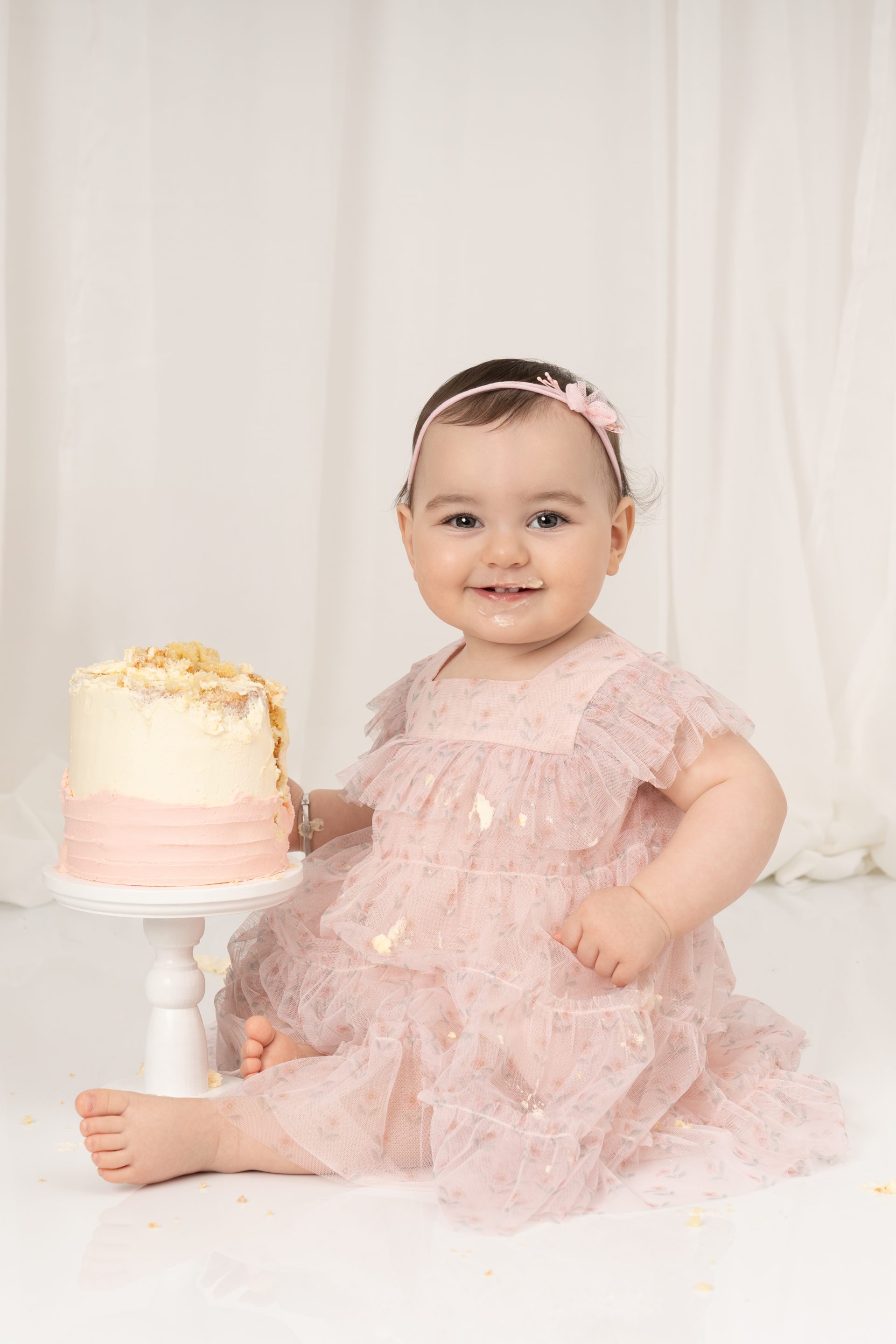 A typical cake smash session lasts around 45–60 minutes, which includes time for prortrait, cake fun, splash and cleanup. We keep it relaxed and baby-led throughout.